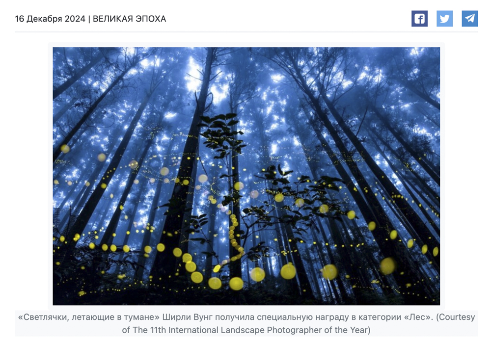 The Atlantic 美國大西洋雜誌報導 『top and winning images #頂級和獲獎圖片』 我的螢火蟲得獎作品是此篇報導的 #首頁照片 。美國大西洋雜誌從 2024 ILPOTY 『Winners of the 2024 International Landscape Photographer of the Year 』 101 件得獎作品中,選出 15 件 top and winning images 頂級和獲獎圖片。超級榮幸我的 Fores Award Winner 森林獎得獎作品被排序在此報導中的編號 No 1 作品