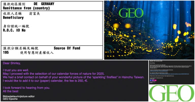 親愛的雪莉, 我希望妳收到此 email 時一切都好。我在 GEO 雜誌的圖片平台工作,該雜誌是德國最受歡迎的雜誌之一,以高標準的攝影和深刻的寫作而聞名。在我們的 KOSMOS 宇宙部分中,我們展示了來自世界各地的單一強大圖像。 在我們的研究中,我們通過“2021 年錫耶納國際攝影獎”發現了您的照片“綠光森林”,並愛上了它,並希望在 GEO 中展示它。我將圖片添加為屏幕截圖,因此您知道我們要發布哪一張。它將在 9 月出版的 GEO 第 10/22 期的雙頁上打印。我們的雙頁標準授權費用是 260 歐元。 如果您有興趣在我們的雜誌上展示您的照片,請給我發送 HiRes 攝影(約 42×28 厘米,300 dpi(約 5000×3500 像素)- 附有詳細說明(地點、時間、原因、誰、準確時間等。 我很高興收到您的回覆,並從德國向您致以最良好的祝願。
