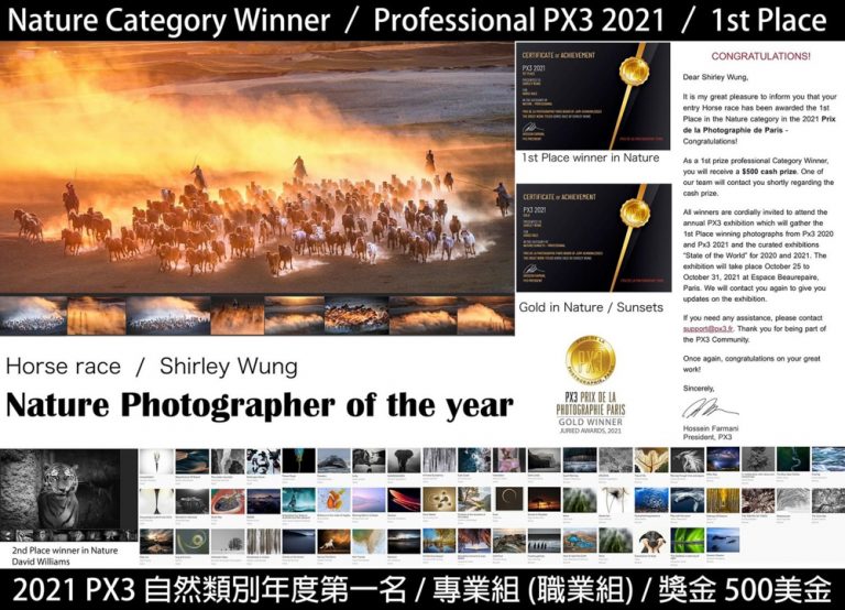 除了得到 Nature photographer of the year PX3專業組自然類別年度攝影師 稱號之外,還幸運得到了【2021 法國 PX3 國際攝影大賽 Professional 職業/專業組】💖 一金 💖 一銀💖 二銅 💖 四榮譽獎等獎項。