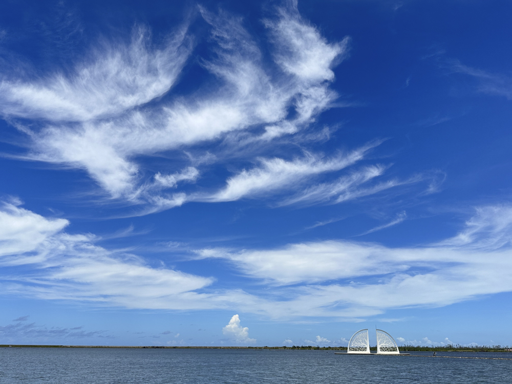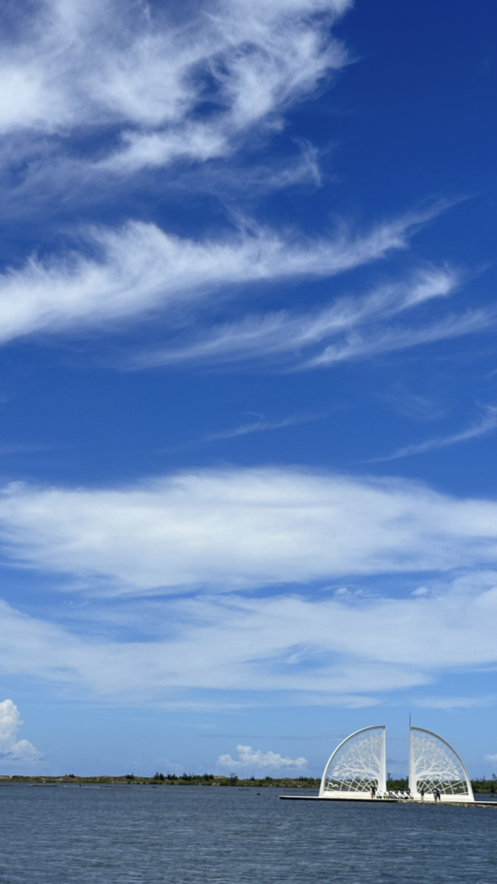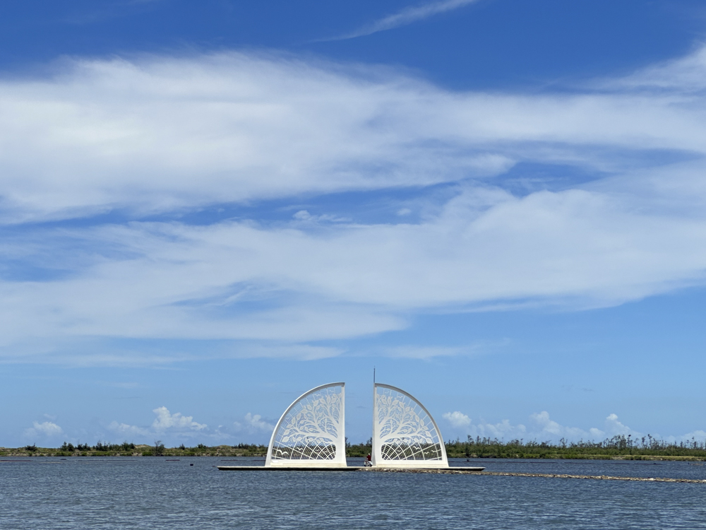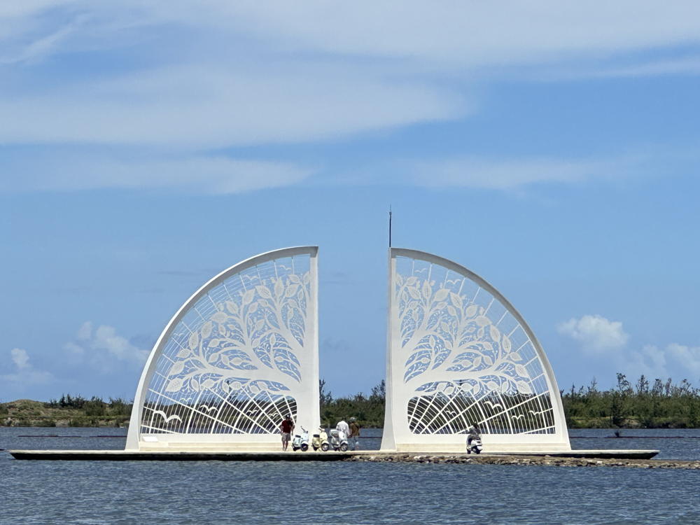 在青鯤鯓扇形鹽田的海面上,矗立著一座象徵希望與能量的藝術品 ~「生命之樹」。純白的拱門對稱綻放,宛如枝葉舒展;兩片扇形在此匯聚,化為一棵永恆而純淨的大樹。