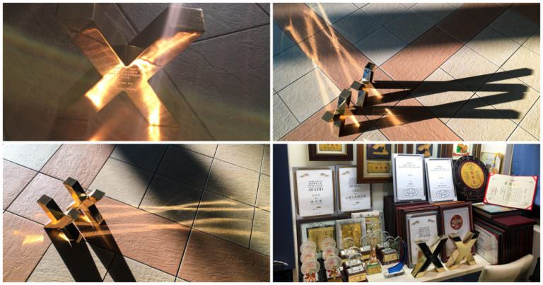 喬了好久才喬到這個角度,地磚中的【X】、獎牌的【X】、右邊獎牌影子的【X】、 左邊獎牌反射的金光【X】。